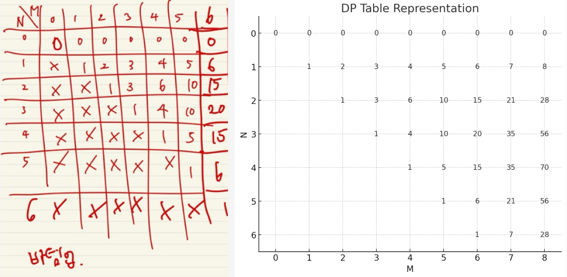 잠이안와서 알고리즘을 풀기로했다. 최근에 책으로 DP풀이에 관한 부분을 읽어서인지 문제를 보자마자 바텀업 방식으로 풀어야겠다고 생각이 들었다. 다리가 N, M으로 있기 때문에 2차원 배열을 써야겠다고 생각