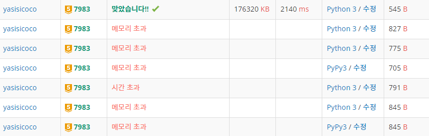 당연하게 시간초과, 메모리 초과 폭탄을 맞았다ㅠ